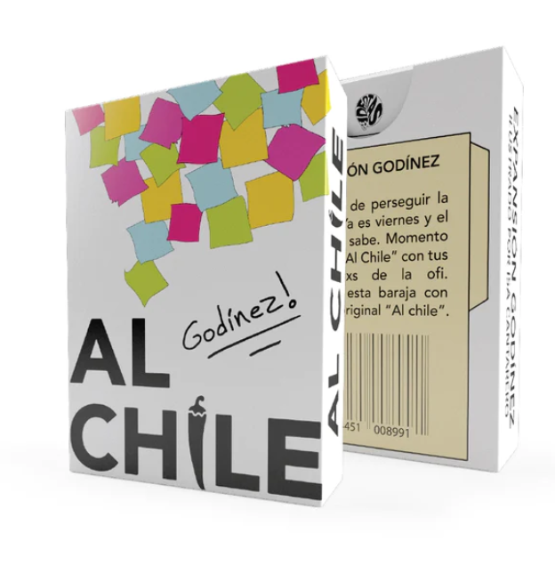Es viernes y el cuerpo lo sabe. La expansión Godínez amplía el juego base “Al Chile” con 60 nuevas cartas de cuatro niveles de intensidad (verde, amarillo, naranja y rojo), pero con cartas de Godínez para jugar en la oficina. Perfecta para desintegrar al equipo.