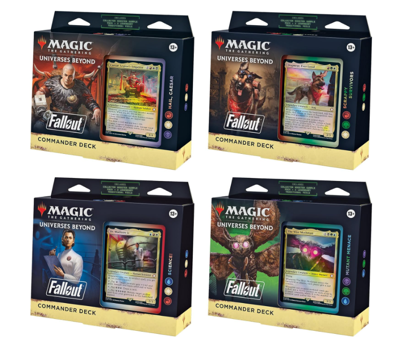 - Obtén las 4 cubiertas de comandante de Fallout: este paquete incluye las 4 mazos Magic: The Gathering Fallout Commander, con 1 baraja de Hail Caesar, 1 mazo Scrappy Survivors, 1 Ciencia. cubierta y 1 baraja de amenaza mutante