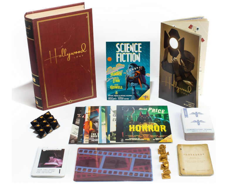 Contenido: 1 caja magnética para libros, 15 carteles de género, 9 tiras de película, 9 dados de estrellas personalizados, 7 fichas esculpidas en oro, 60 tarjetas de propaganda, 9 tarjetas de trabajo y 9 tarjetas de lealtad.