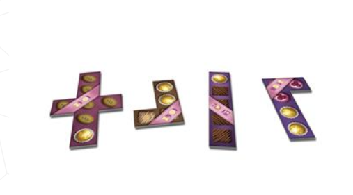 1 tablero de Tiempo, 2 tableros de Caja, 2 Corazones, 1 peón Neutral, 33 piezas, 5 Petit-four, 1 pieza Especial, 50 Bombones y 1 reglamento.