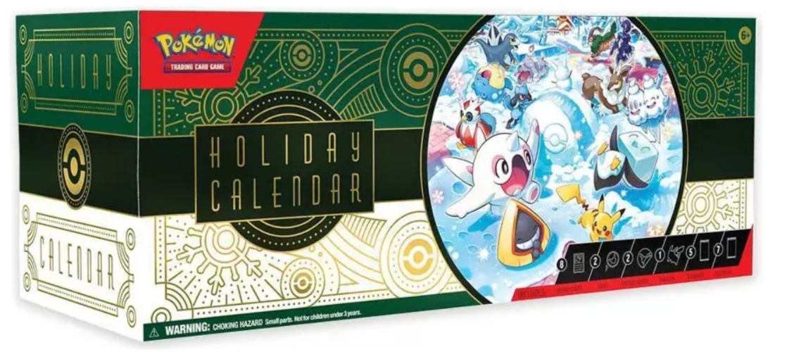 El Pokémon TCG: Holiday Calendar 2024 en inglés no incluye mazos completos, sino que contiene 8 cartas holográficas con un sello festivo, 5 sobres de Pokémon TCG, 7 paquetes de 3 cartas, 2 monedas Pokémon, 2 láminas de stickers Pokémon, 1 colgante de Chien-Pao y 1 carta de código para Pokémon TCG Live