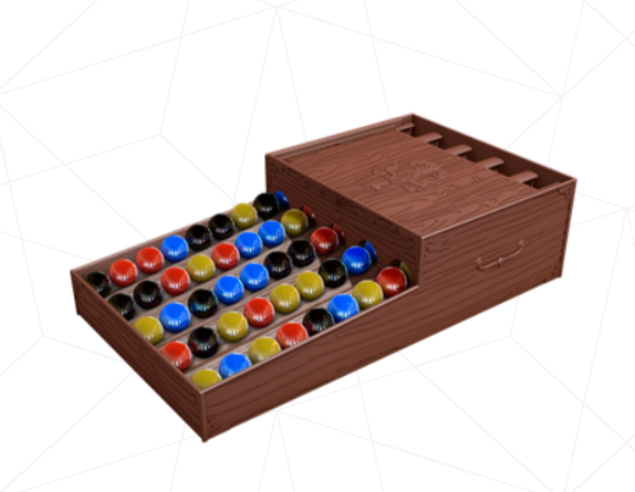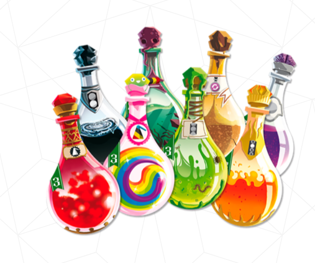 1 reglamento, 4 tableros de Pupitre, 64 piezas de Poción, 80 canicas de Ingrediente (en cuatro colores diferentes), 15 fichas de Maestría, 21 fichas de Ayuda del profesor, 1 ficha de Jugador inicial y 1 Dispensador de plástico.