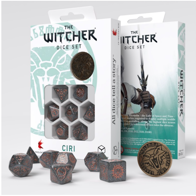 An heir to Lara Dorren. Inspired by The Witcher franchise, this dice set is dedicated to Cirilla Fiona Elen Riannon, a carrier of Elder Blood. The set contains 7 polyhedrons, and a metal coin featuring Ciri’s depiction. Each dice has white material with aquamarine engravings. The highest value faces, and coin reverse, are adorned with the School of Cat symbol.
