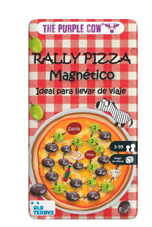 TO GO – RALLY PIZZA es un Juego magnético de recorrido, estrategia y acumulación en caja de lata para 2 jugadores. Por turnos, los jugadores lanzan el dado y van avanzando por la pizza con el objetivo de llegar a meta con el mayor número de aceitunas. Aunque atención, llegar el primer a meta no implica ganar la partida, ya que la partida sigue hasta que todos llegan al final. Mientras siga la partidas, las aceitunas se siguen repartiendo. Atención que el recorrido hay también casillas especiales con champiñones y salsa de picante. Un divertido juego para llevar a cualquier parte. La caja sirve de tablero de juego y las instrucciones están impresas en la misma.